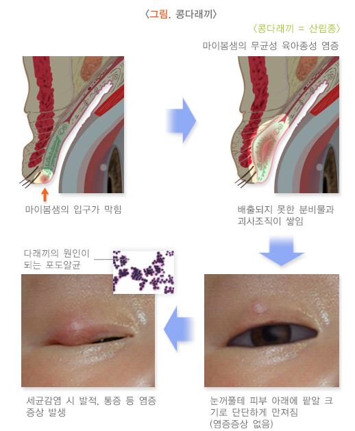 눈꺼풀은 다른 피부와 마찬가지로 여러 분비샘들이 있습니다. 눈꺼풀 바깥쪽에는 속눈썹 주변에 땀을 분비하는 샘(몰샘, Moll's gland)과 기름 성분을 분비하는 피지샘(짜이스샘, gland of Zeis)이 있고, 안쪽으로는 눈꺼풀판 안에 눈물층의 기름 성분을 분비하는 마이봄샘(Meibomian gland) 등이 있습니다. 다래끼와 콩다래끼는 이러한 눈꺼풀의 분비샘에서 생기는 염증성 질환을 말합니다.