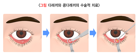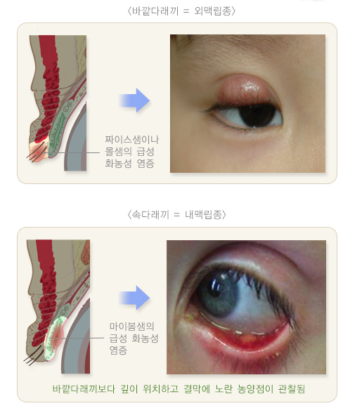 콩다래끼는 세균 감염이 아니라 마이봄샘의 배출구가 막히면서 배출되지 않은 기름 성분이 눈꺼풀판과 주위 조직으로 침윤되어 생긴 만성적인 육아종성 염증입니다. 때로는 세균에 감염되면 속다래끼와 비슷한 모습을 보일 수도 있습니다. 바깥다래끼는 눈꺼풀 표면에 가까이 위치합니다. 초기에는 약간 빨갛게 붓고 가려운데, 곧 심하게 부어오르며 통증이 생깁니다. 며칠이 지나면 단단해지고 통증이 감소하며 농양(고름집)이 생기면서 결국은 피부로 배출됩니다. 그러나 경우에 따라서는 인접한 속눈썹뿌리로 감염이 확대되어 다발성으로 발생할 수도 있고, 자주 재발하기도 합니다. 속다래끼는 바깥다래끼보다 눈꺼풀 깊숙이 위치하고 눈꺼풀판결막에 노란 농양점이 관찰되는 것으로 구별할 수 있습니다.