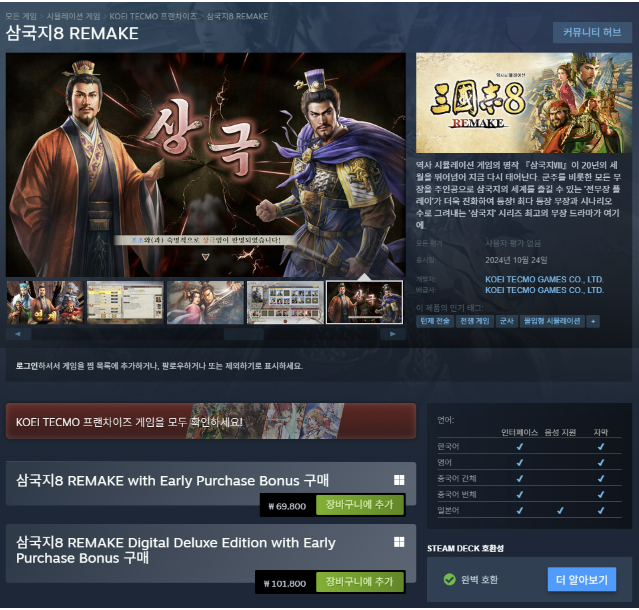 #삼국지8 #리메이크 #게임정보 #코에이테크모 #전략게임 #출시일 #게임사양 #플랫폼