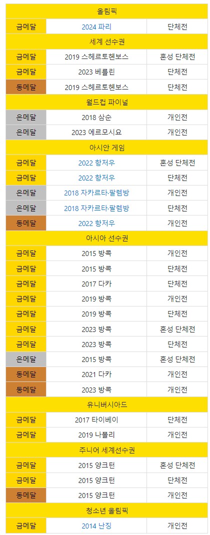 - 2024년 파리 올림픽: 개인전 금메달, 단체전 금메달, 혼성전 금메달
