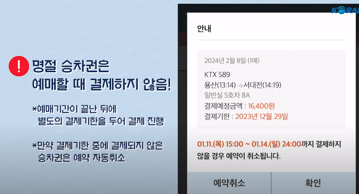 Tip: 명절 승차권은 예매 할 때 결제 하지 않아요(예매뒤 별도의 결제기간이 있어요!!)