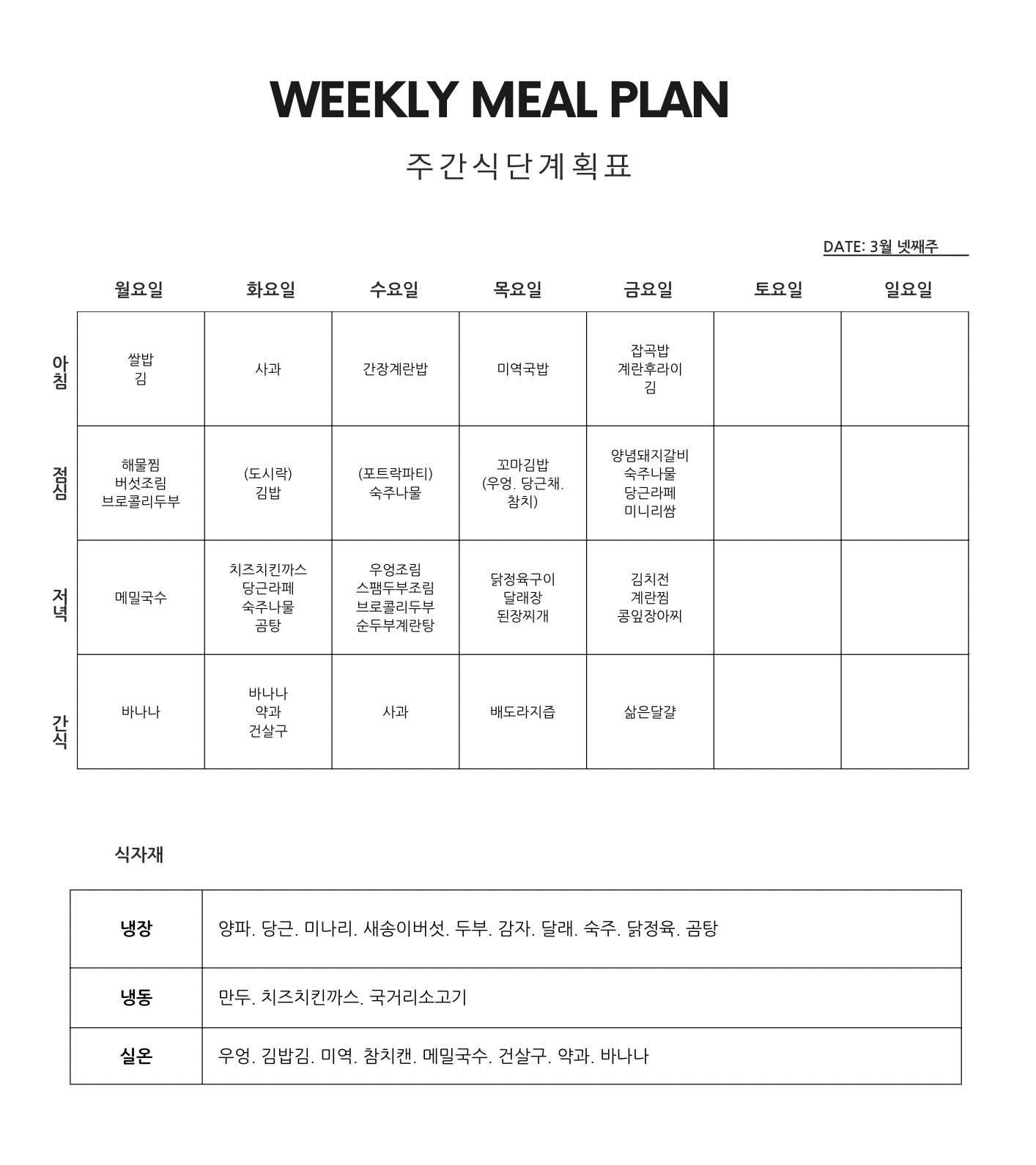 | (3월 첫째주) 일주일식단표 제공, 저녁메뉴 추천 (0) | 2024.04.14 |