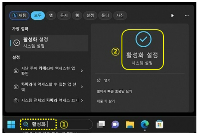 검색창에 활성화를 입력한 후, 검색 결과에서 **[활성화 설정]**을 클릭하세요.